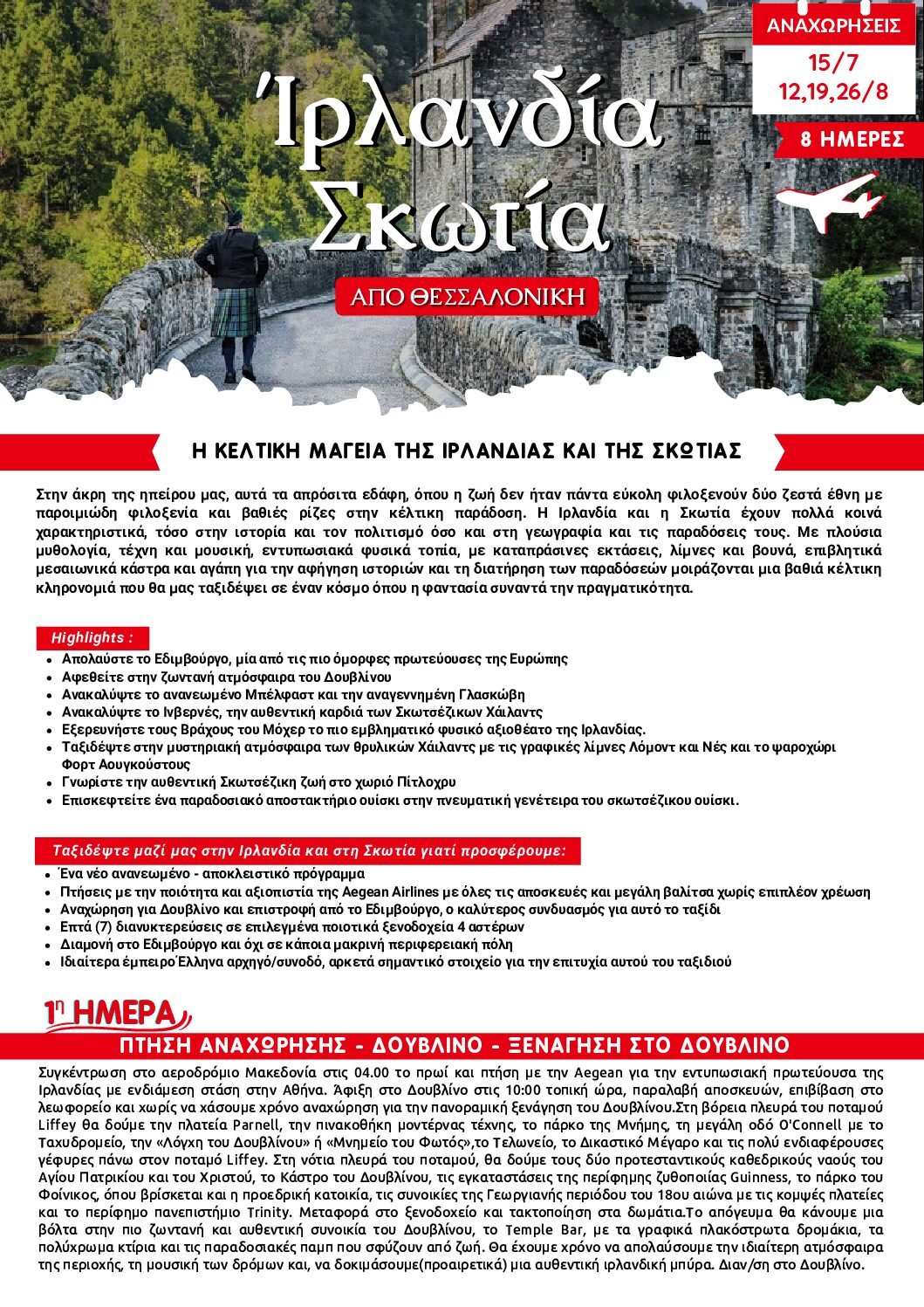 Στην άκρη της ηπείρου μας, δύο έθνη με παροιμιώδη φιλοξενία και βαθιές ρίζες στην κέλτικη παράδοση μας περιμένουν. Με πλούσια μυθολογία, εντυπωσιακά φυσικά τοπία, επιβλητικά μεσαιωνικά κάστρα και αγάπη για την αφήγηση ιστοριών, η Ιρλανδία και η Σκωτία μοιράζονται μια κληρονομιά που θα μας ταξιδέψει σε έναν κόσμο όπου η φαντασία συναντά την πραγματικότητα.